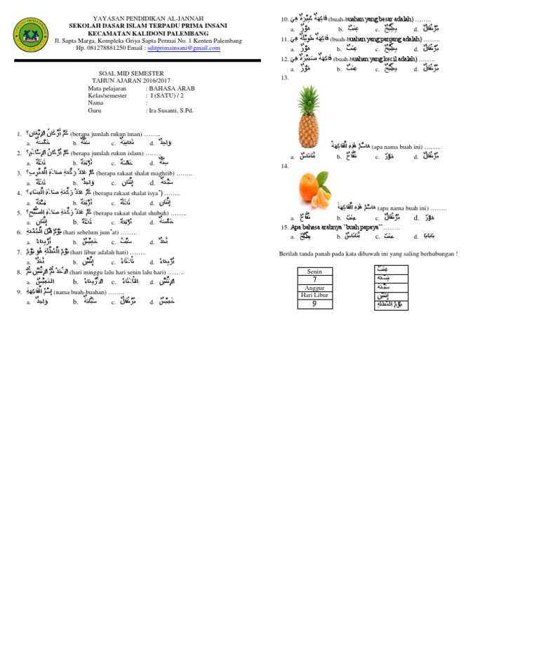 Ulangan akhir semester (uas) ganjil tahun pelajaran 2015/2016 sd it sabilul huda kota cirebon! soal bahasa arab semester 2 kelas 1. Dalam kesempatan kali ini kami bagikan lengkap untuk soal bahasa arab kelas 1/2/3/4/5/6 yang mungkin sesuai dengan.